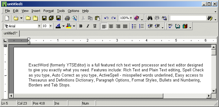 ExactWord (formerly YTSEditor) is a full featured rich text word processor and text editor designed to give you exactly what you need. Rich Text Formatting gives you all the control of word processing formats such as Bold, Italic, Underline, Superscript X2, Subscript X2, Strikeout, Numbers & Bullets, Paragraph Layout such as Left-Center-Right-Justify Alignment, Indents, Margins, Borders, Tab Stops, Format Styles, Paragraph Options, all the Font choices; Name-Size-Color and Highlight Color. ExactWord also gives you control of the Measurements: Metric (centimeters) or English . ExactWord will become your favored application to write little notes or large rich text documents.